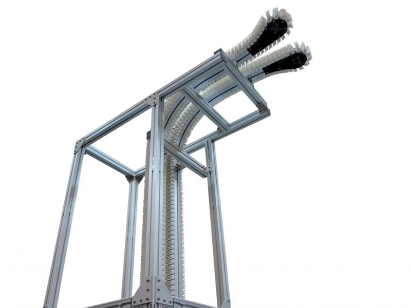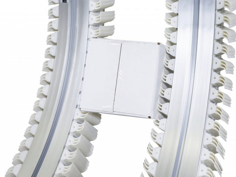 夾持輸送機(jī)由2臺相互平行的FlexMove輸送機(jī)組成,利用聚氨酯夾緊鏈板楔夾住產(chǎn)品的兩側(cè)實現(xiàn)垂直升降。
