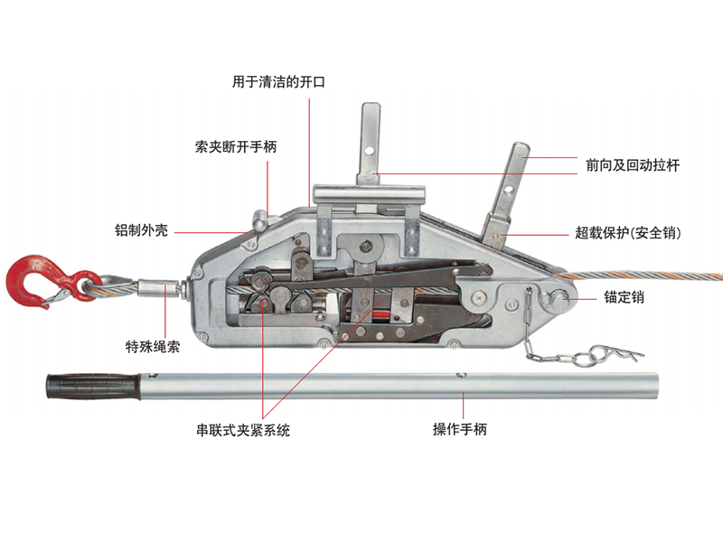 ●采用前后兩個獨立的手柄操作桿設計控制鋼絲繩的拉緊及松開動作,整個機體小巧緊湊,并保證拉力沿中線傳送。
